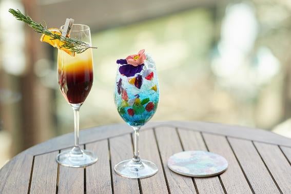 今回のコラボレーションを記念して、「異彩」にインスパイアされたオリジナルカクテル・モクテルを提供します。「Prominence」は、太陽の表面から黒炎が舞い上がる異彩を放つプロミネンスを表現したカクテルです。テキーラ・カシスなど独立したカクテルを組み合わせることで、混沌した黒い月の周りの紅炎を表現しました。「Flower Mojito」は、グラスという透明のキャンバスに、爽やかなミントと彩り鮮やかな花たちを用いて、モヒートスタイルにデザイン。新たな芽が秘める様々な未来を彷彿させるような、新たな春の始まりを感じさせるモクテルです。