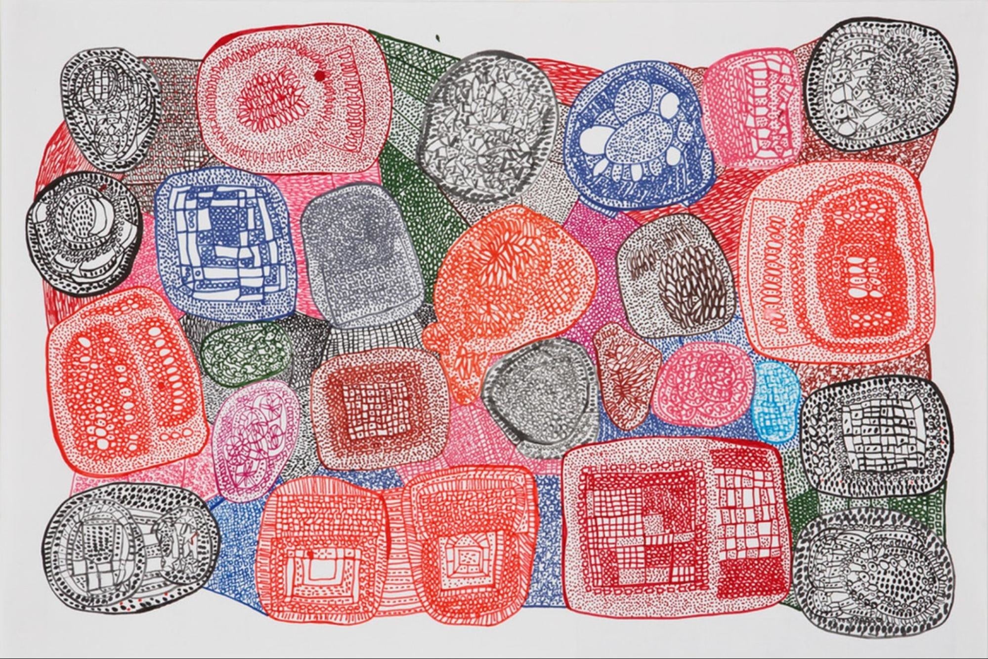 ブラシマーカーを用い、躍動に満ちた膨大な形と色彩がひしめく緻密な画面を生み出す。 小さな頃から塗り絵が好きだったが、初めて「自分の絵」を描き始めたのは19歳の時。 以来、堰を切ったように鮮烈な色彩と精緻な構成からなる作品を次々に生み出していった。「ワープロ」「おりがみ」というタイトルは、アーティスト自身がつけたものである。