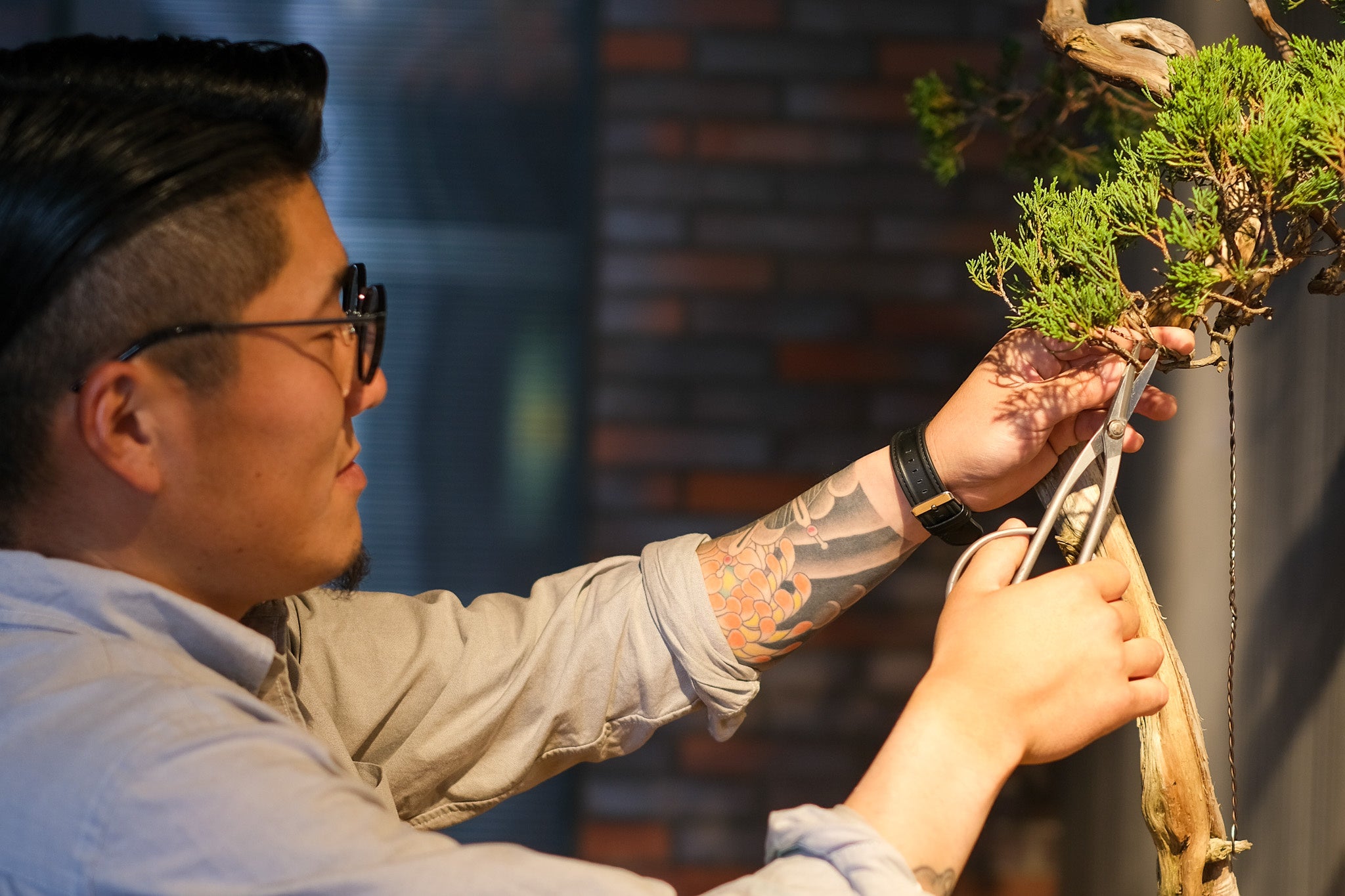 盆栽アーティスト兼外構職人。1996年、福山市生まれ。盆栽は松柏類(マツやビャクシンなど)をメインに扱う。