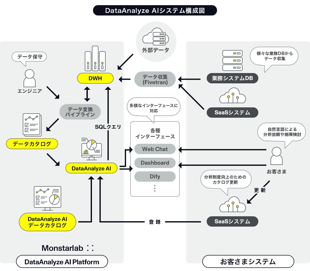 企業の変革を実行するInnovative Engineering Partnerの株式会社モンスターラボ(本社:東京都渋谷区、代表取締役社長:鮄川 宏樹、以下「モンスターラボ」)は、本日より自然言語によるデータ基盤の分析を支援する新サービス『DataAnalyze AI』の提供を開始いたしました。当社の高度なデータエンジニアリングの知見と、生成AI(LLM)を活用したデータ基盤の学習・統合により、複数の基盤にまたがるデータをSQLクエリを使用せず自然言語での抽出・分析が可能になり、ビジネスの変革に対応する柔軟なレポーティングを支援します。