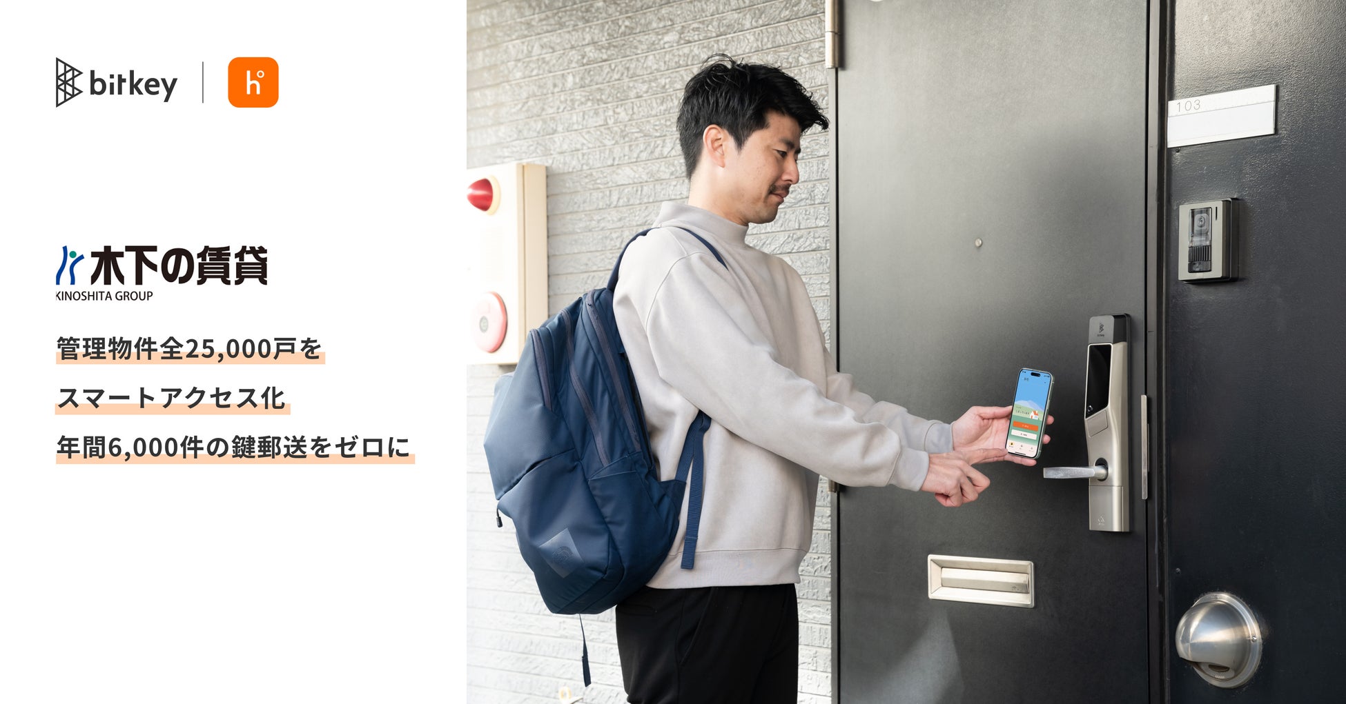 株式会社ビットキー(本社:東京都中央区、代表取締役:寳槻 昌則・福澤 匡規、以下ビットキー)は、株式会社 木下の賃貸(本社:東京都新宿区、代表取締役社長:尾﨑 浩司、以下木下の賃貸)が管理する全物件約25,000戸を対象に、業務効率化を目的として、ビットキーの暮らしのコネクトプラットフォームhomehubと、homehubと連携したスマートロックが採用されることをお知らせします。これにより、鍵の受渡・交換、紛失時対応などの鍵管理業務が不要となるほか、年間約6,000件発生していた鍵郵送の業務とコストの削減を実現いたします。