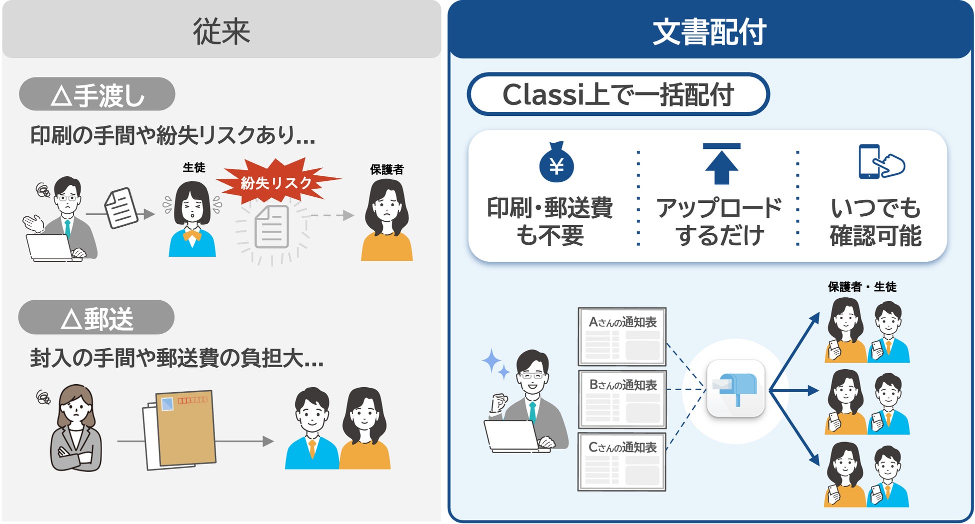 これまで、通知表や領収書など、生徒一人ひとりに異なる個別文書を配付する際には、印刷・手渡しや郵送による対応が必須とされていました。先生方、事務職員の方々による書類の印刷や封入といった作業負担に加え、郵送費などのコストが発生し、さらに紛失リスクも伴うなど、学校現場にとって大きな負担となっていました。