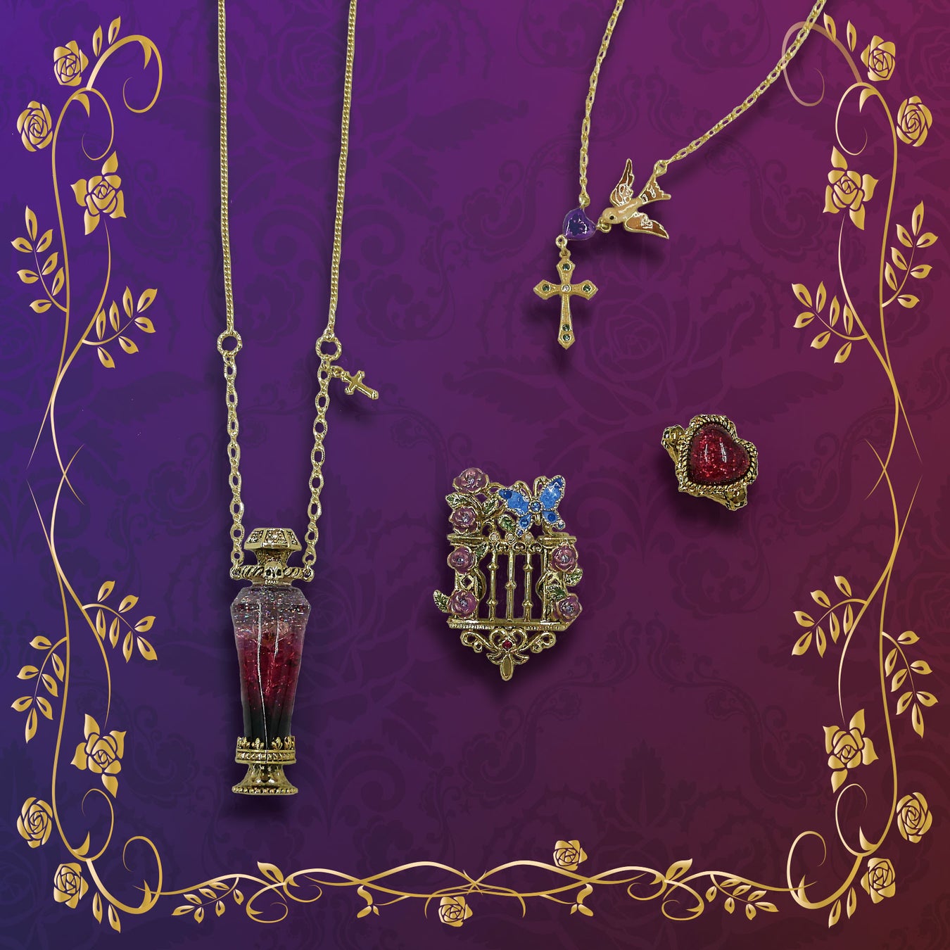 作中に登場する毒の小瓶をイメージしたネックレスや、2人が愛を囁き合うバルコニーがモチーフのブローチなど、『ロミオとジュリエット』を象徴するアイテムが揃います。