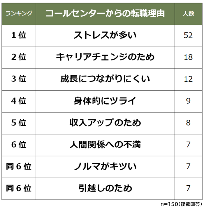 コールセンターから異職種へ転職した経験がある人に「転職理由」を聞いたところ、第1位は「ストレスが多い」でした。