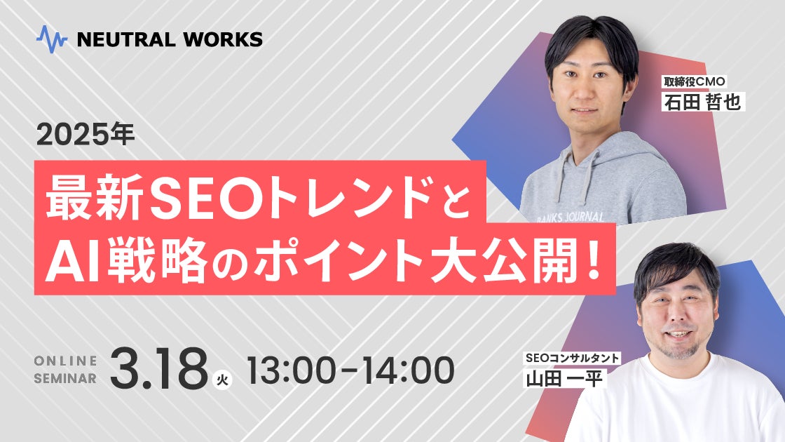 2025年3月18日(火) 13:00より、株式会社ニュートラルワークス主催のオンラインセミナーを参加費用無料で実施します。