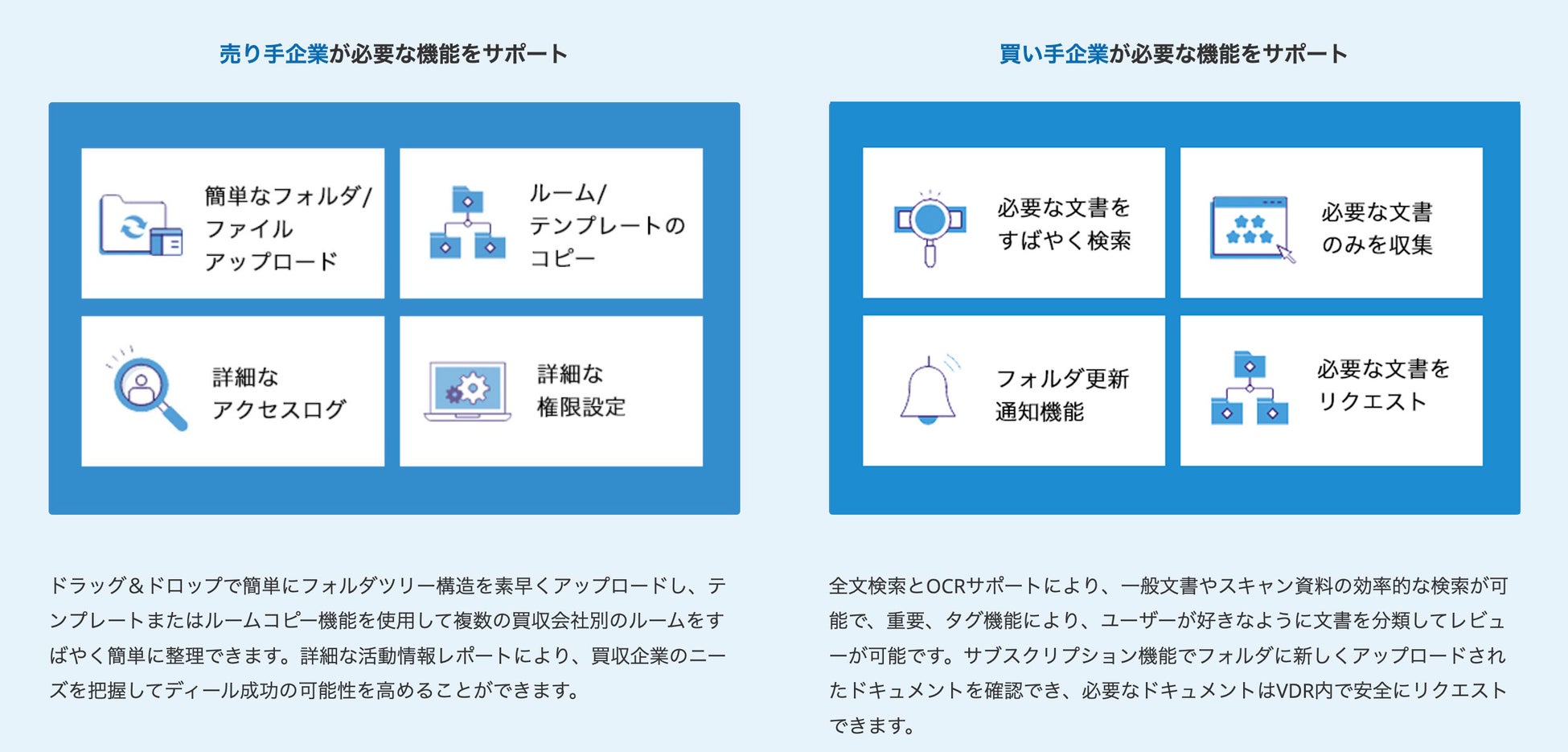 また、買い手企業が必要な機能として、必要な文書をすばやく検索、必要な文書のみを収集、フォルダ更新通知機能、必要な文書のリクエストなどをサポートしています。