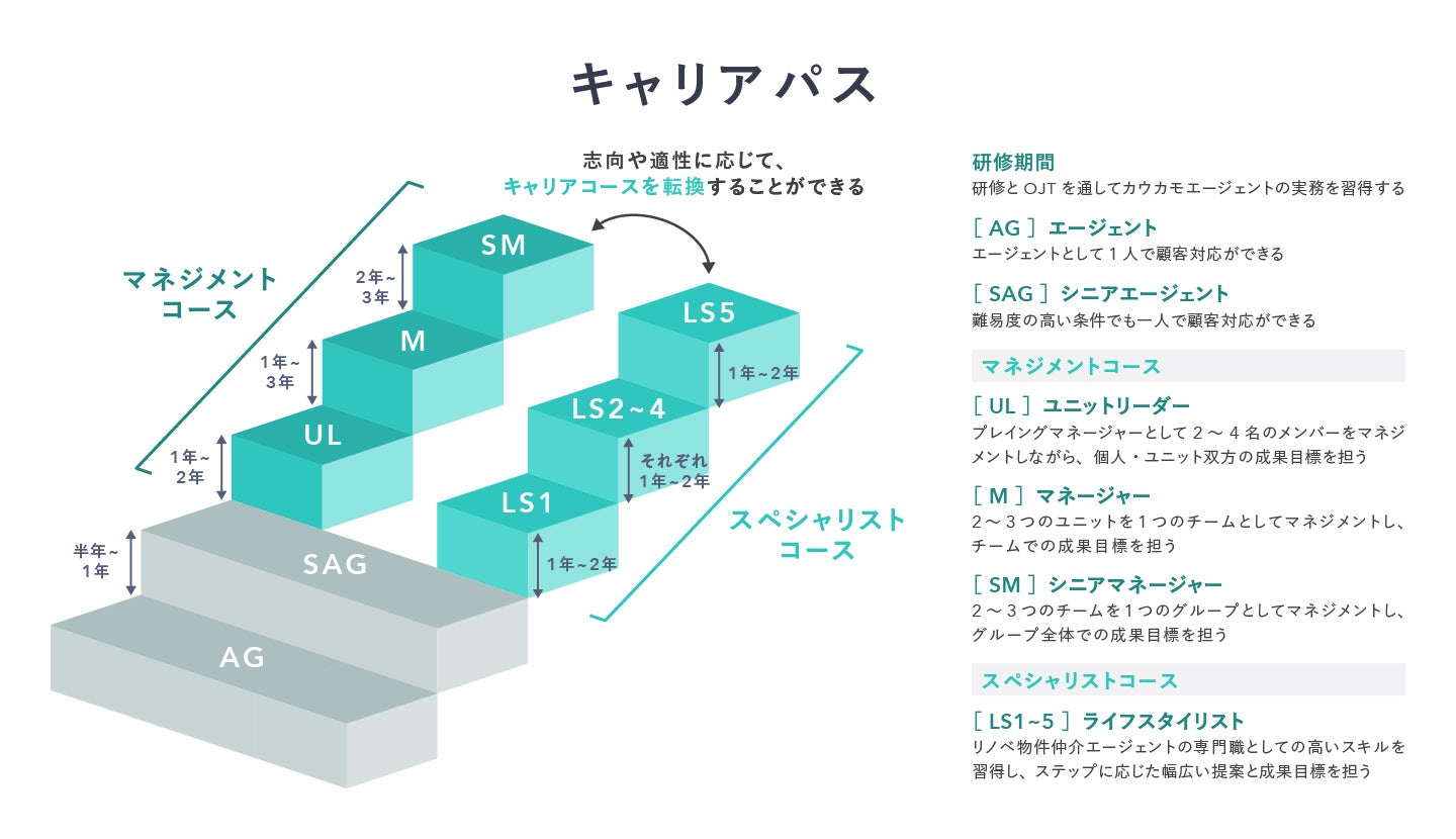 「ライフスタイリスト」の開始により、カウカモエージェントのキャリアステップは、マネジメント職を目指すコースと、専門職としての専門性を磨き続けるコースの2つを選択できるようになりました。