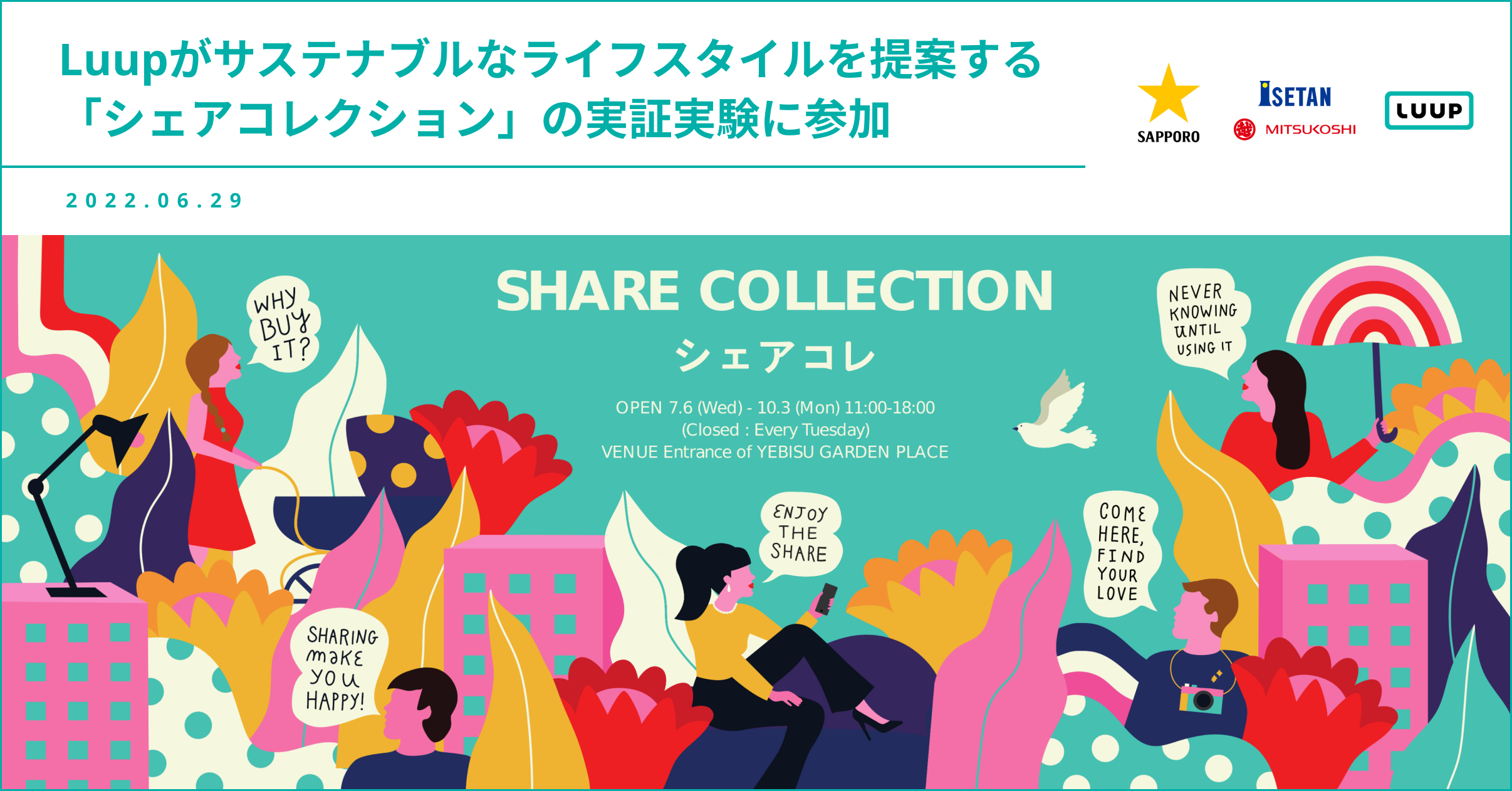 電動キックボードや小型電動アシスト自転車などの「電動マイクロモビリティ」を取り扱うシェアリングサービス「LUUP(ループ)」を展開する株式会社Luup(本社:東京都渋谷区、代表取締役社長兼CEO:岡井大輝、以下「Luup」)は、サッポロ不動産開発株式会社(本社:東京都渋谷区、代表取締役社長:時松浩、以下「サッポロ不動産開発」)が株式会社三越伊勢丹(本社:東京都新宿区、代表取締役社長執行役員:細谷敏幸、以下「三越伊勢丹」)の協力のもと恵比寿ガーデンプレイスにて実施する、シェアリングサービス事業者が提供する複数のアイテムをリアル空間に集め、サステナブルなライフスタイルを提案する「シェアコレクション」事業の実証実験に参加します。