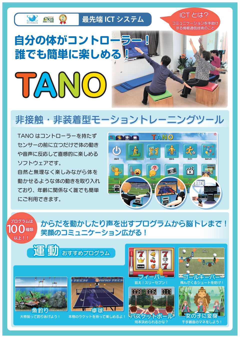 TANOは、モーションセンサーを活用した福祉・介護・教育分野向けのゲーミフィケーションテクノロジーです。300種類以上の豊富なコンテンツを備えており、現場の声や利用者、専門家の意見を反映して開発されています。これにより、現場での利用が容易になり、利用者の自発的な参加を促進し、日常生活でのコミュニケーションを豊かにすることを目指しています。