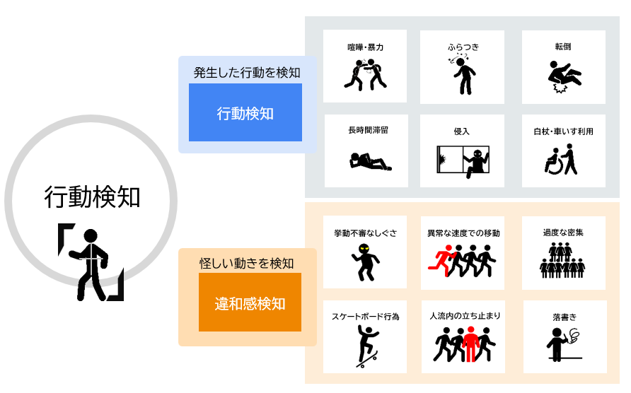 各カメラ画角における通常行動をAIが自律学習し、学習した通常行動から逸脱した動きを「違和感」として検知。事件事故の未然防止に繋げます。