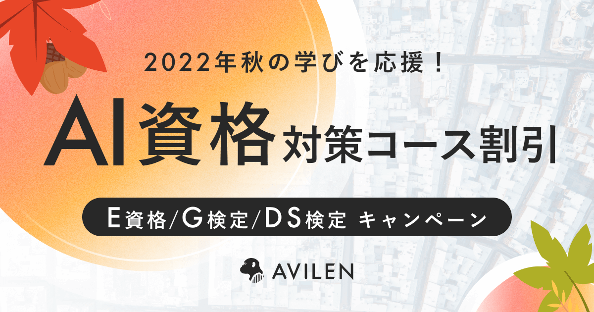 株式会社AVILEN(東京都中央区、代表取締役:高橋 光太郎、以下「AVILEN」)は、2022年9月1日から9月30日まで「2022年秋の学びを応援!全人類がわかるAI・データサイエンス資格対策シリーズ割引キャンペーン」を開催します。