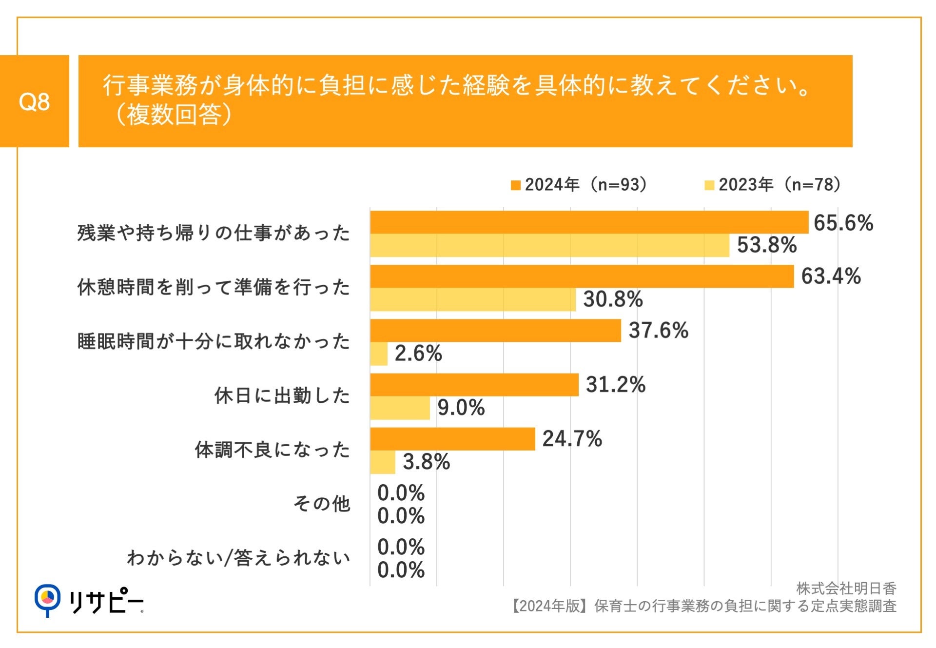 Q7で「かなりある」「ややある」と回答した方に、「Q8.行事業務が身体的に負担に感じた経験を具体的に教えてください。(複数回答)」(n=93)と質問したところ、「残業や持ち帰りの仕事があった」が65.6%、「休憩時間を削って準備を行った」が63.4%、「睡眠時間が十分に取れなかった」が37.6%という回答となりました。