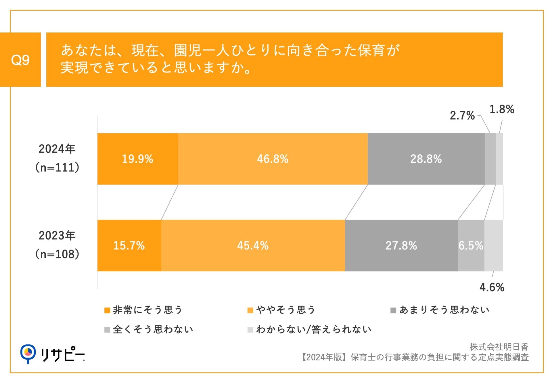 「Q9.あなたは、現在、園児一人ひとりに向き合った保育が実現できていると思いますか。」(n=111)と質問したところ、「あまりそう思わない」が28.8%、「全くそう思わない」が2.7%という回答となりました。