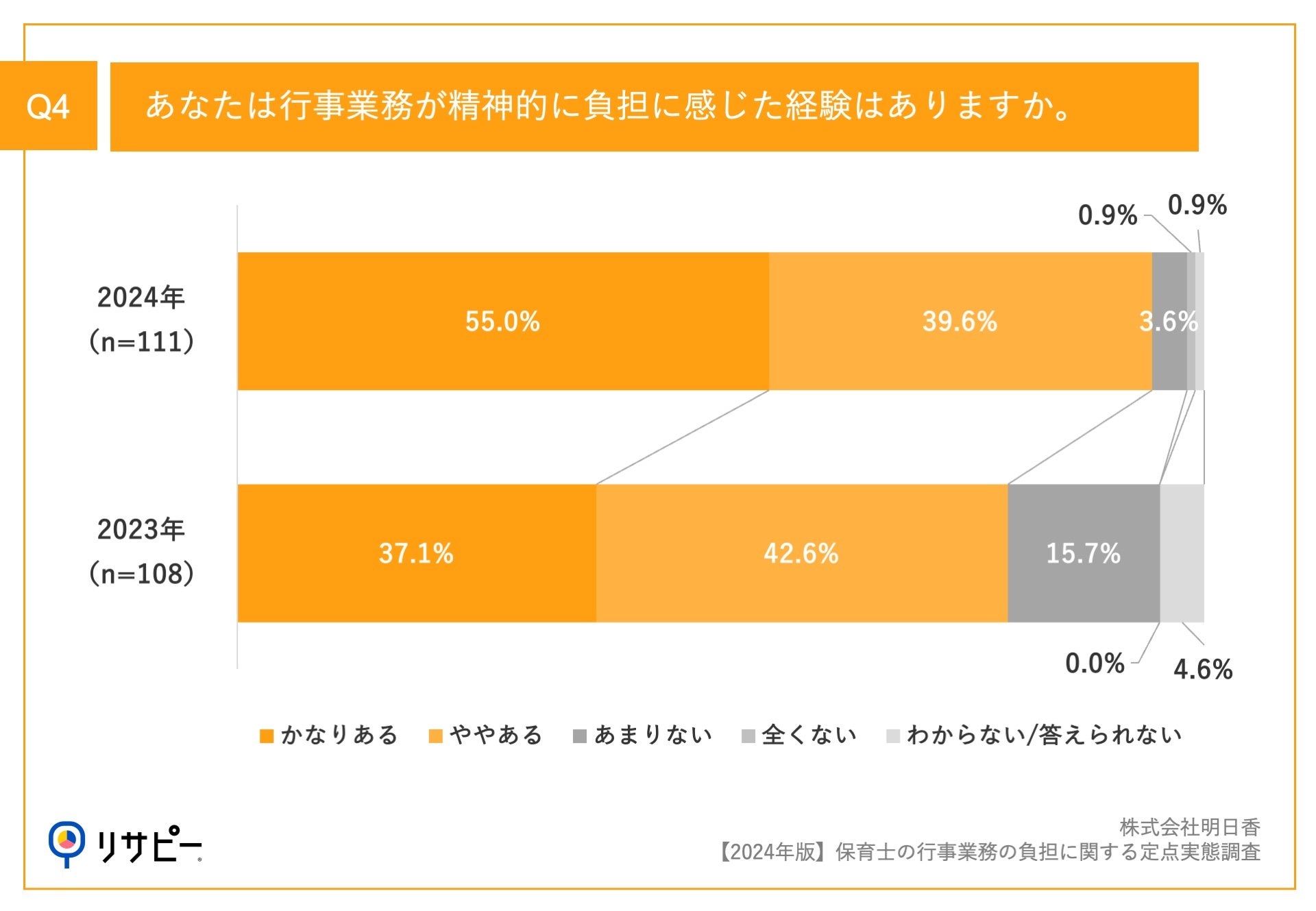 「Q4.あなたは行事業務が精神的に負担に感じた経験はありますか。」(n=111)と質問したところ、「かなりある」が55.0%、「ややある」が39.6%という回答となりました。