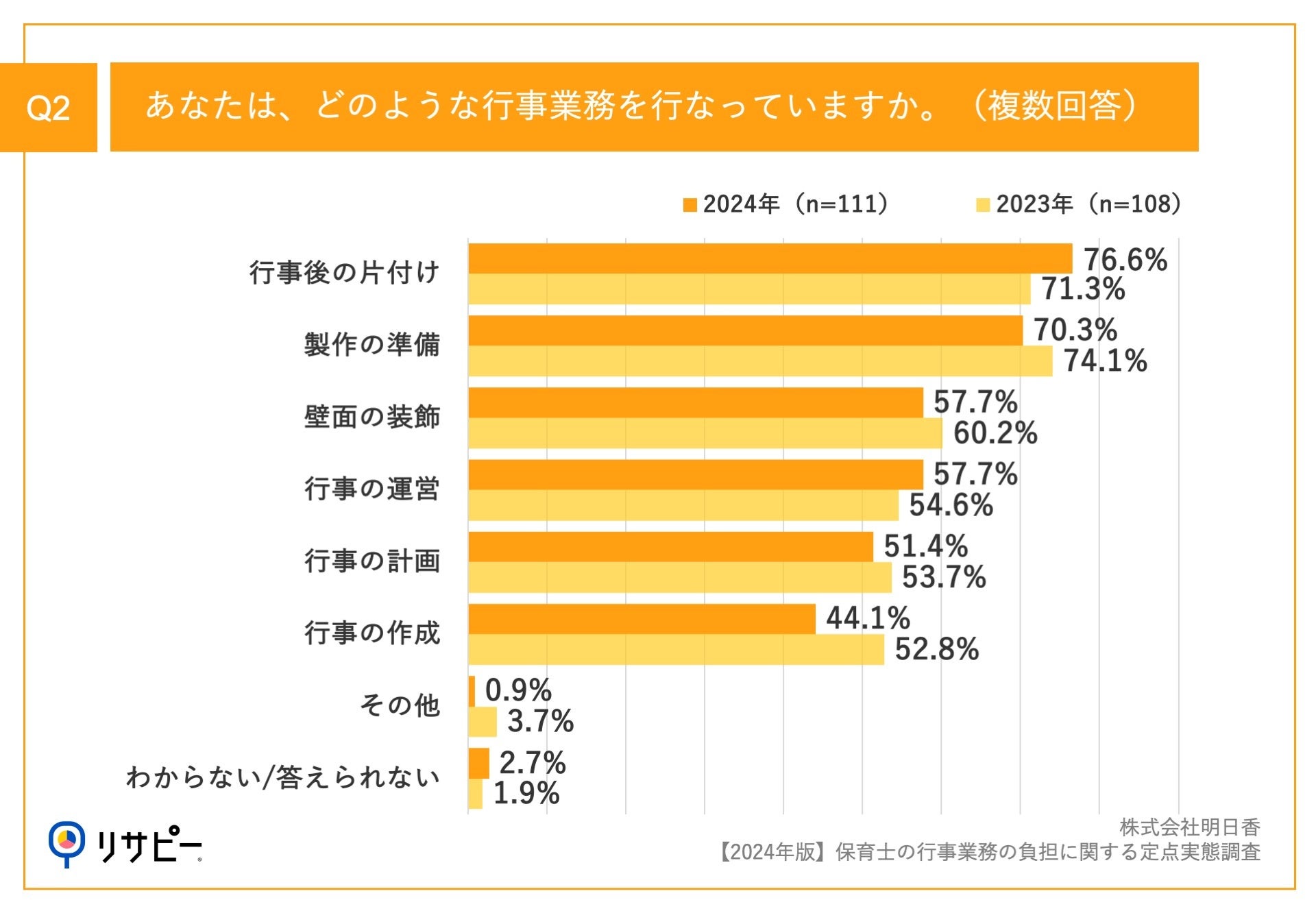 「Q2.あなたは、どのような行事業務を行なっていますか。(複数回答)」(n=111)と質問したところ、「行事後の片付け」が76.6%、「製作の準備」が70.3%という回答となりました。