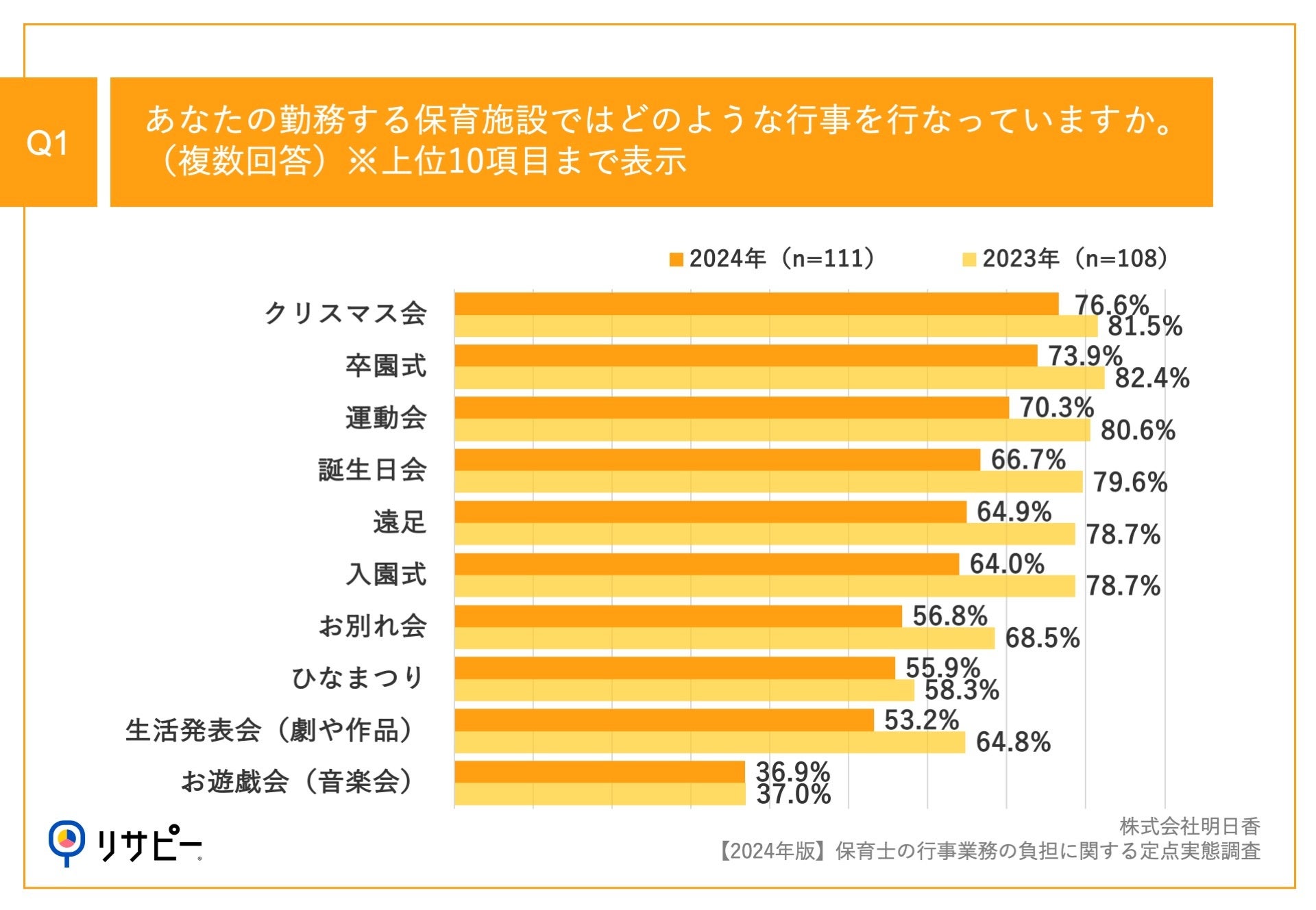 「Q1.あなたの勤務する保育施設ではどのような行事を行なっていますか。(複数回答)」(n=111)と質問したところ、「クリスマス会」が76.6%、「卒園式」が73.9%、「運動会」が70.3%という回答となりました。