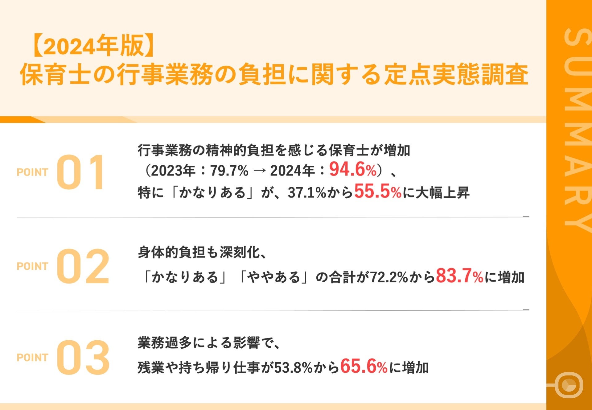 01|行事業務の精神的負担を感じる保育士が増加(2023年:79.7%→2024年:94.6%)、特に「かなりある」が、37.1%から55.5%に大幅上昇