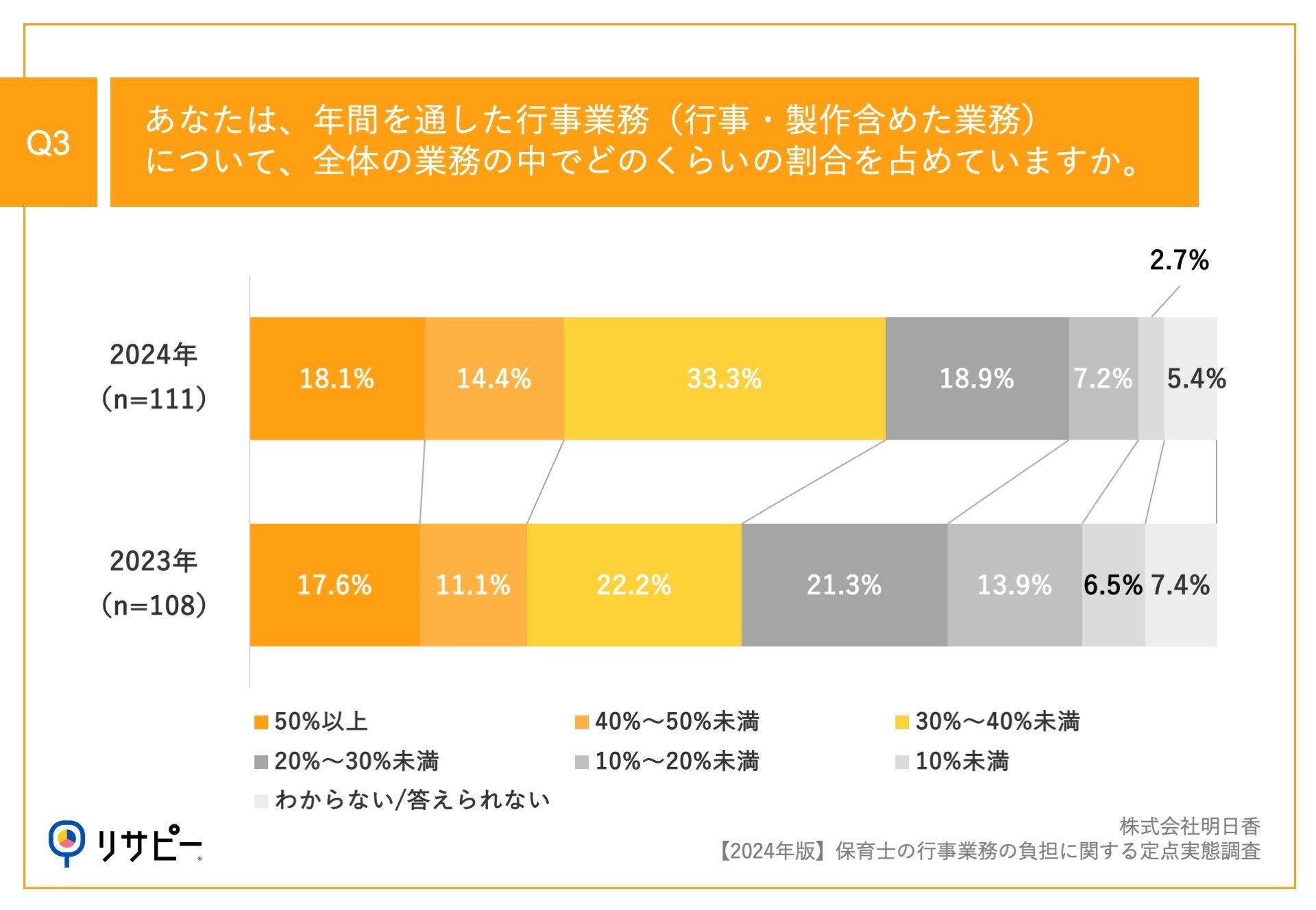 「Q3.あなたは、年間を通した行事業務(行事・製作含めた業務)について、全体の業務の中でどのくらいの割合を占めていますか。」(n=111)と質問したところ、「30%~40%未満」が33.3%、「40%~50%未満」が14.4%という回答となりました。