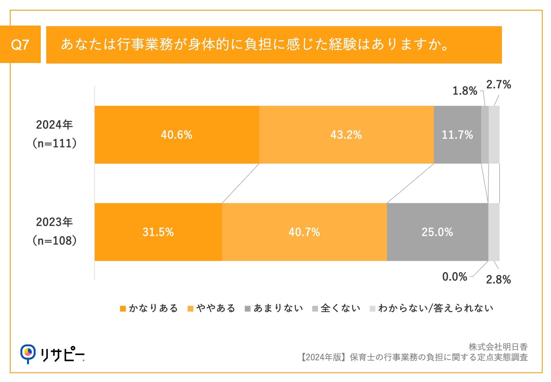 「Q7.あなたは行事業務が身体的に負担に感じた経験はありますか。」(n=111)と質問したところ、「かなりある」が40.6%、「ややある」が43.2%という回答となりました。