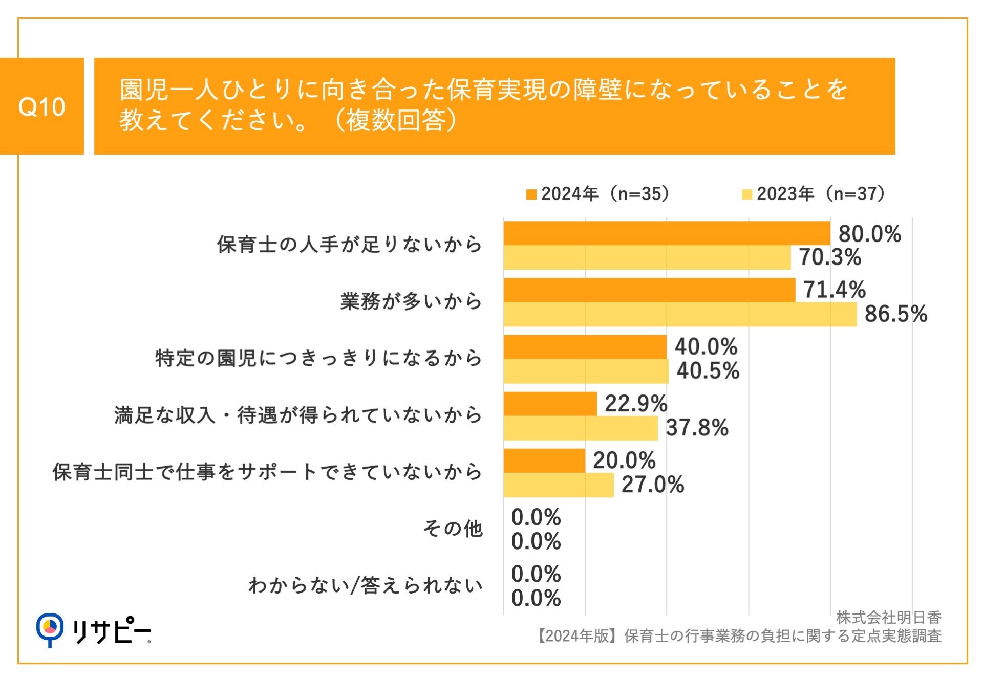 Q9で「あまりそう思わない」「全くそう思わない」と回答した方に、「Q10.園児一人ひとりに向き合った保育実現の障壁になっていることを教えてください。(複数回答)」(n=35)と質問したところ、「保育士の人手が足りないから」が80.0%、「業務が多いから」が71.4%、「特定の園児につきっきりになるから」が40.0%という回答となりました。
