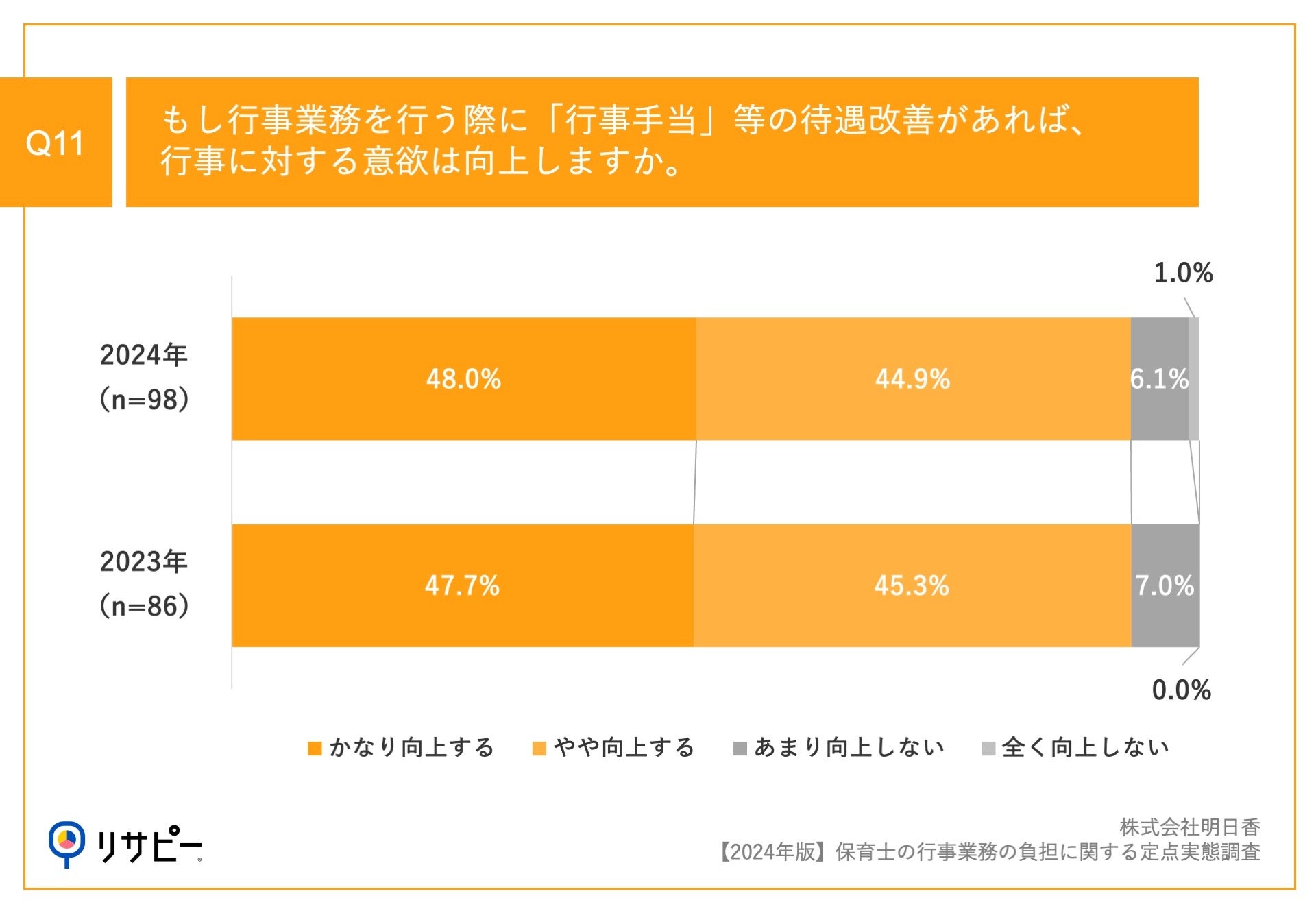 Q4で行事業務が精神的に負担に感じた経験が「かなりある」「ややある」と回答した方に、「Q11.もし行事業務を行う際に「行事手当」等の待遇改善があれば、行事に対する意欲は向上しますか。」(n=98)と質問したところ、「かなり向上する」が48.0%、「やや向上する」が44.9%という回答となりました。
