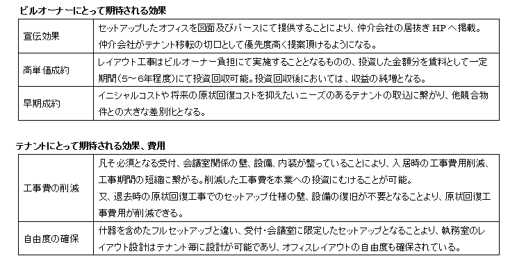 ・セットアップでの募集方法も一部の不動産会社にて実施しておりますが、セットアップを望むテナントのみしか取込できず、逆に顧客を限定してしまうことにも繋がっております。