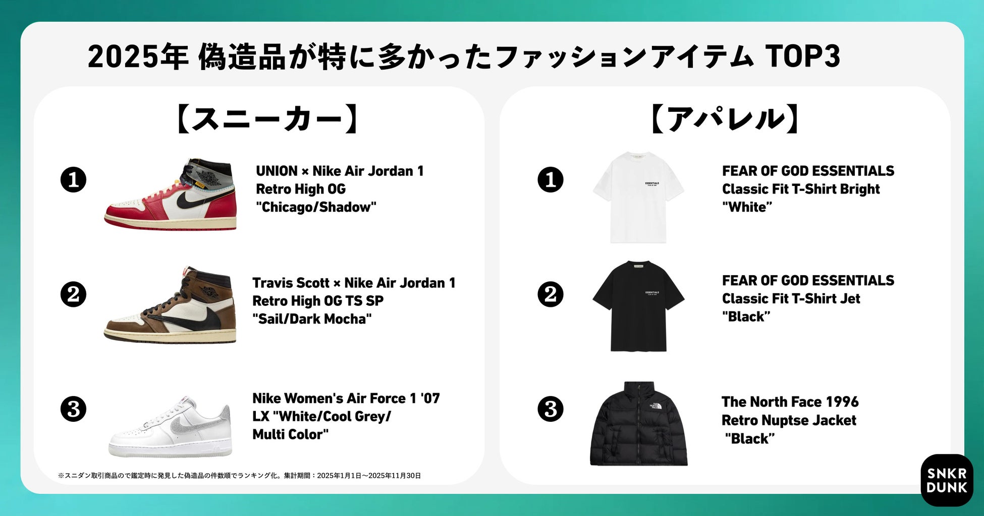 「UNION × Nike Air Jordan 1」でした。UNION(ユニオン)と「エアジョーダン 1」のコラボは、2018年に第一弾が大ヒットしたため、「第二弾も間違いなく人気になる」という注目商品であったことから、発売前から偽造品が数多く流通したといわれています。3位には「Nike Women's Air Force 1」がランクインしています。「エア フォース 1」は女性人気も高く、定価で手に入る定番商品ですが、”欲しい人”が多いことを背景に偽造品が作られています。スニーカーについては、「希少性があるプレミア価格のつく商品」と「定価で手に入る人気の定番商品」の2つの傾向で作られていることが、偽造品の最新トレンドといえます。また、これまではメンズスニーカーの偽造品が数多く流通していましたが、2025年はレディーススニーカーの偽造品も増えている傾向にあります。