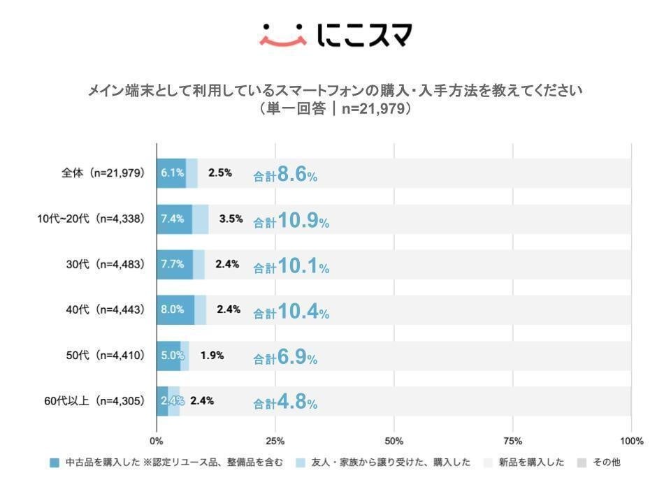 10代~60代以上の男女21,979名に、メイン端末として利用しているスマートフォンの購入・入手方法を質問したところ、10代・20代では「中古品を購入した※限定リユース品、整備品を含む」(7.4%)と「友人・家族から譲り受けた、購入した」(3.5%)、あわせて10.9%が中古スマートフォンをメイン端末として利用していると回答しました。