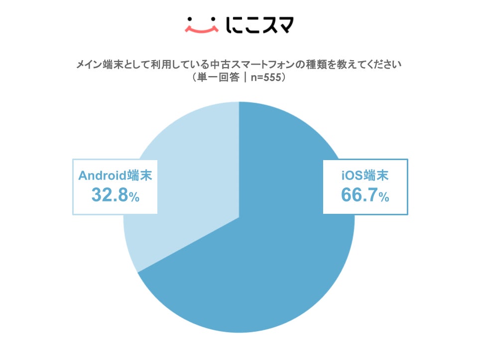 中古スマートフォンをメイン端末として利用する10代~60代以上の男女555名に、端末の種類を質問したところ、66.7%がiOS端末、32.8%がAndroid端末を利用していると回答しました。