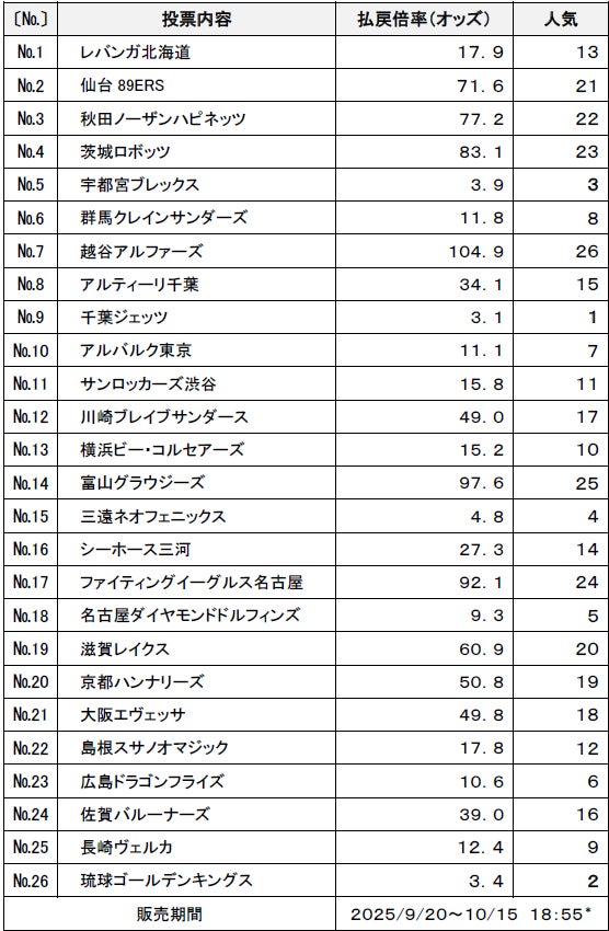 B1優勝チーム予想の1番人気は、 昨シーズンベスト4の千葉ジェッツで、払戻倍率(オッズ)は3.1倍!2番人気は、昨シーズン2位の琉球ゴールデンキングスで、払戻倍率(オッズ)は3.4倍、3番人気は、昨シーズン優勝の宇都宮ブレックスで、払戻倍率(オッズ)は3.9倍となっています。