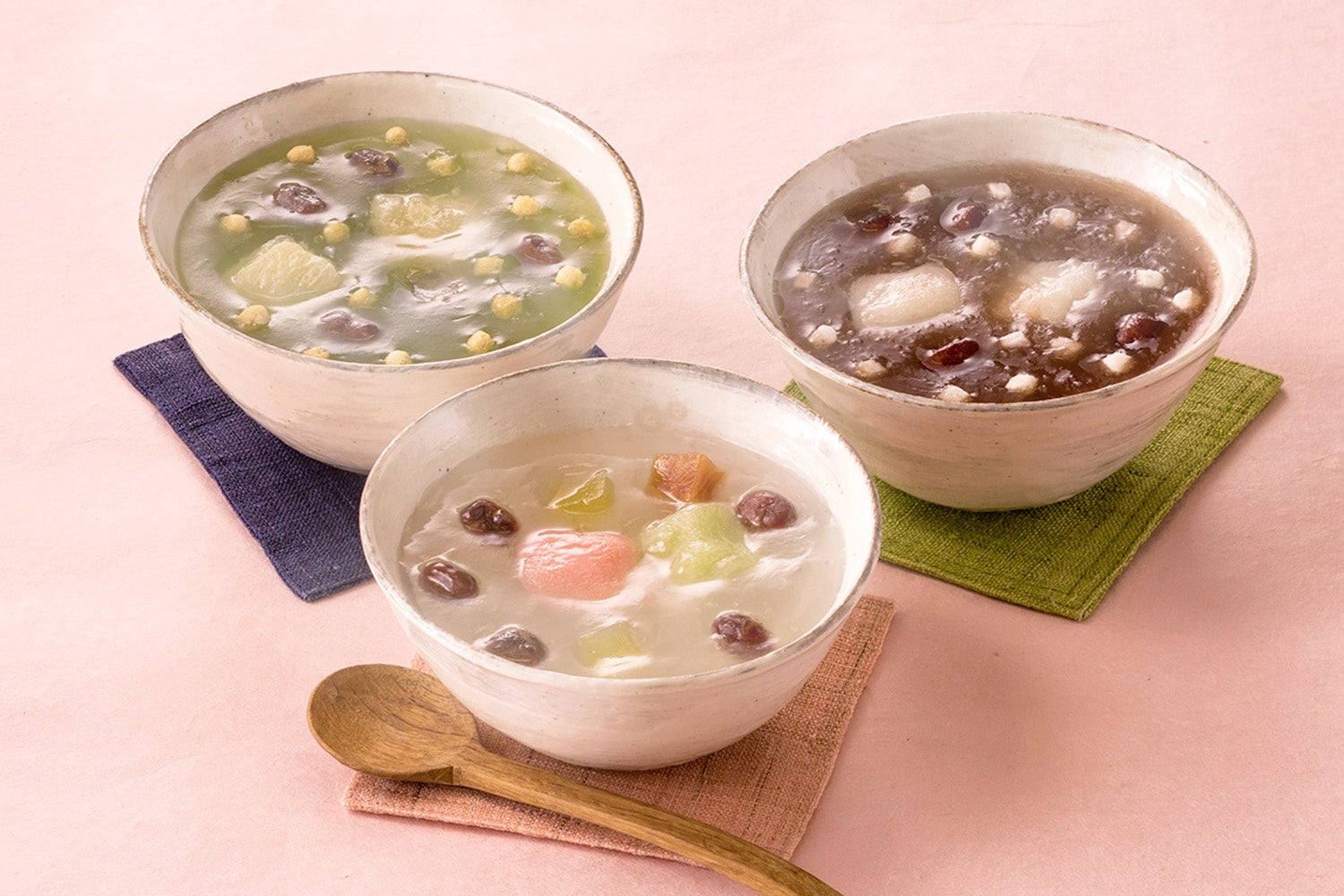 熱湯を注いですぐできる、即席の「おしるこ」「くず湯」です。とろりあたたか『みつ豆くず湯』に『挽茶あられ』、小豆の風味さらりと美味しい『風流しるこ』の3種。