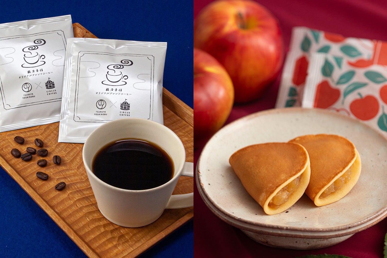 「鶴屋吉信オリジナルブレンドコーヒー」と、しっとり・もっちり美味しいベストセラー焼菓子「つばらつばら りんご」、冬の縁起菓「福ハ内」をお詰め合わせに。和菓子との相性を重視したコーヒーは、一杯ずつお楽しみいただける便利なドリップタイプで、和菓子との香り豊かなひとときをお楽しみいただけます。