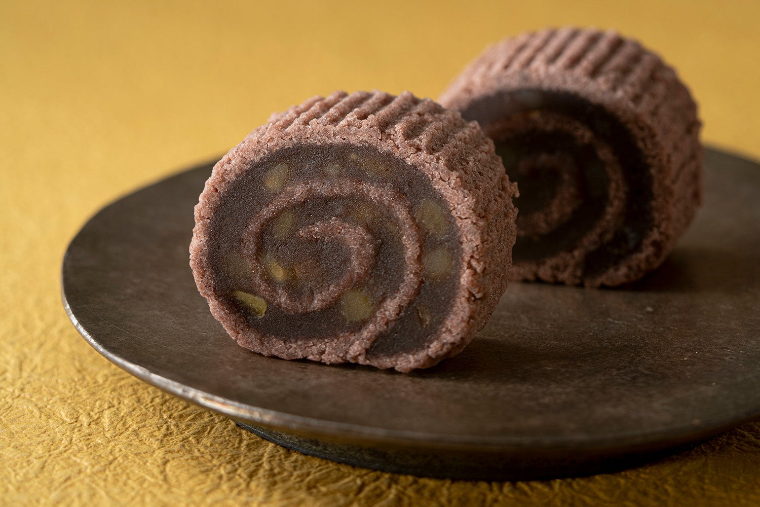 代表銘菓「京観世」に、ほどよく刻んだ国産和栗と栗のペーストをこめて村雨で巻き上げました、秋冬だけの期間限定版です。風味豊かな小倉羹とほくほくの栗がしっとり馴染み、冬のお茶時間にぴったりな奥深い美味しさに。