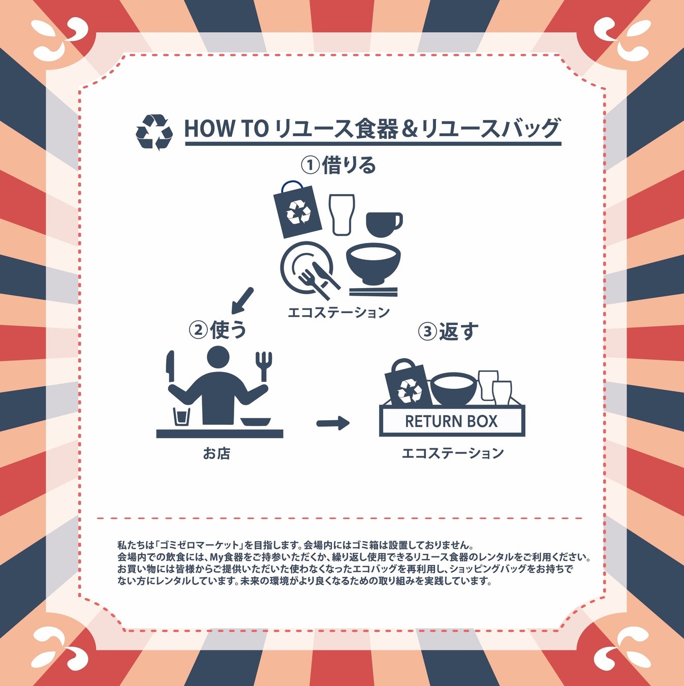 ごみ焼却に伴い排出される二酸化炭素の削減、プラスチックごみの問題に配慮した「ごみゼロ」マルシェとして開催しています。会場内では使い捨て容器でのご飲食はご遠慮いただいております。ご自宅からマイ食器をお持ちいただくか、貸出のリユース食器をご使用ください。