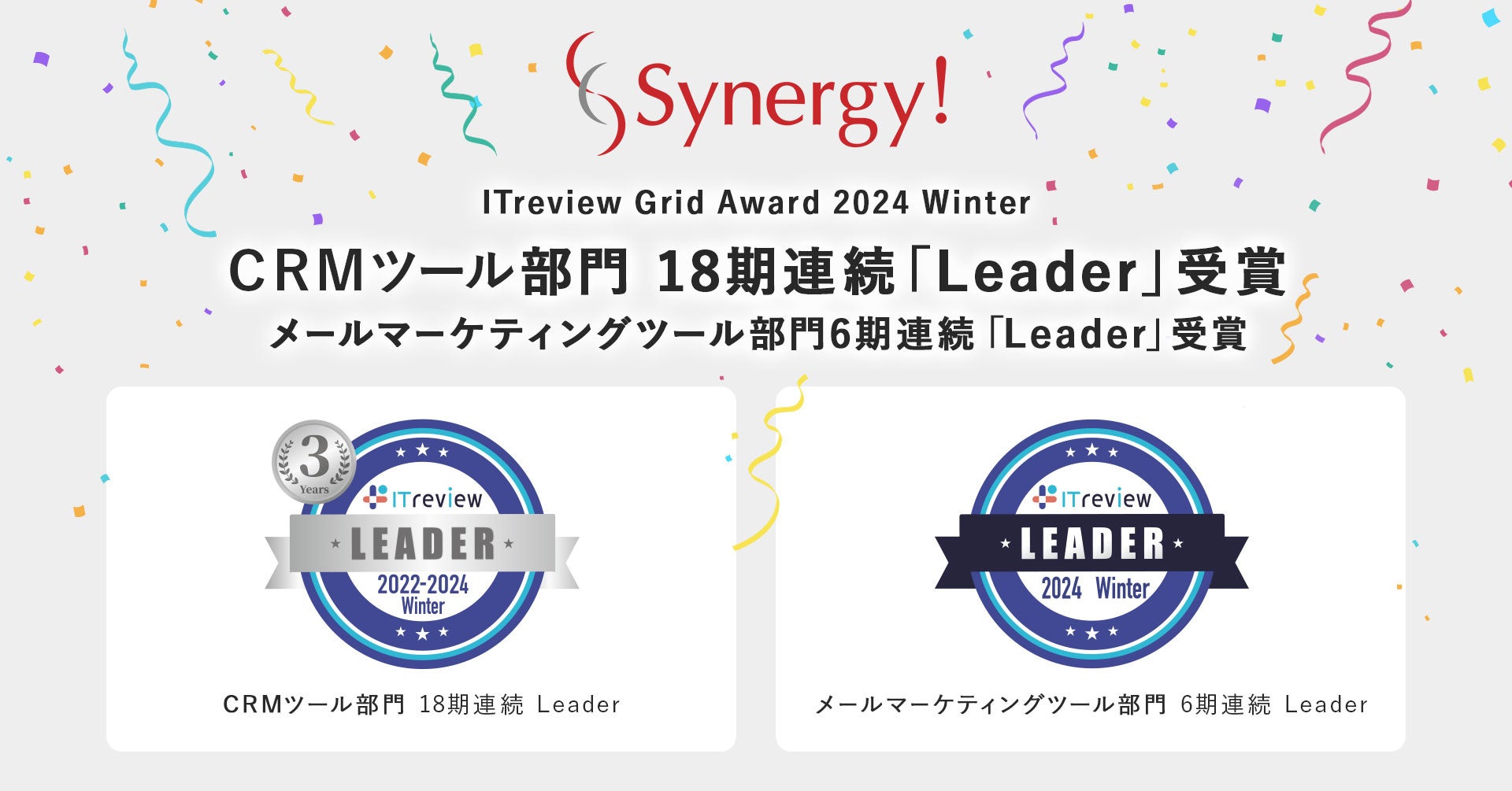 シナジーマーケティング株式会社(以下当社)は、当社が提供するクラウド型サービス「Synergy!(シナジー)」がアイティクラウド株式会社(本社:東京都港区、代表取締役社長:黒野源太)運営のIT製品レビュープラットフォーム「ITreview(アイティレビュー)」において、満足度、認知度ともに優れた製品であると評価され「ITreview Grid Award 2024 Winter」CRMツールおよびメールマーケティングツール部門において最高位「Leader」を受賞したことをお知らせします。CRMツール部門における「Leader」受賞は18期連続となります。