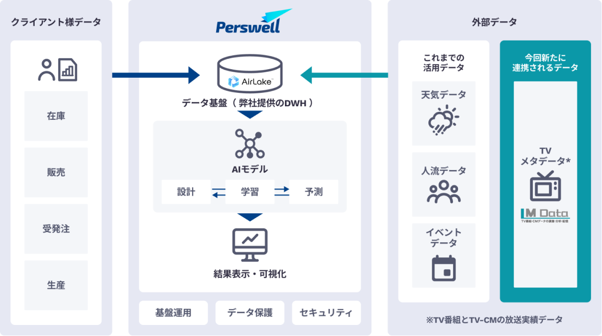 最新アルゴリズムと外部データを活用した需要予測サービス「Perswell」と、テレビ番組やCMの情報を独自にサマリー化した「TVメタデータ」を組み合わせ、メディアの影響力を反映した未来予測を可能に