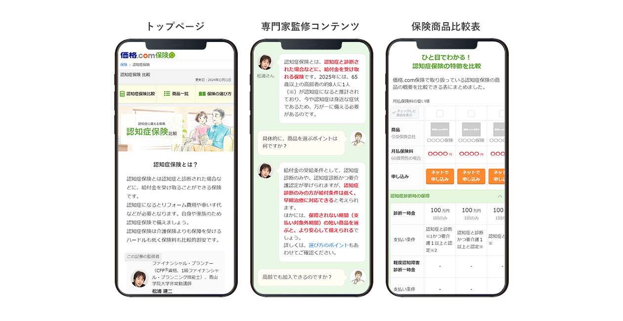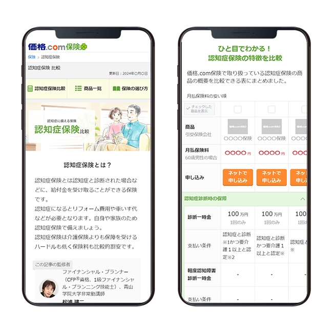 認知症保険とは、認知症と診断された場合などに、給付金を受け取ることができる保険です。2025年には、65歳以上の高齢者の約8人に1人(※2)が認知症になると推計されており、今や認知症は身近な症状です。そこで、「価格.com保険」では、より最適な保険選びができるよう、認知症保険比較ページの提供を開始しました。専門家監修コンテンツや、各商品の概要を一目で確認できる比較表によって、認知症保険選びがスムーズにできるようになりました。