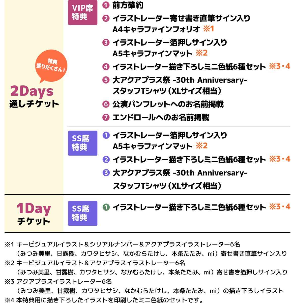 以下の販売サイトにて、大アクアプラス祭のチケットを一般発売中です。SS席は「イラストレーター箔押しサイン入り A5キャラファインマット」(2Days通しチケット特典)や「イラストレーター描き下ろしミニ色紙6種セット」(2Days通しチケット・1Dayチケット共通)など豪華購入特典付きです。