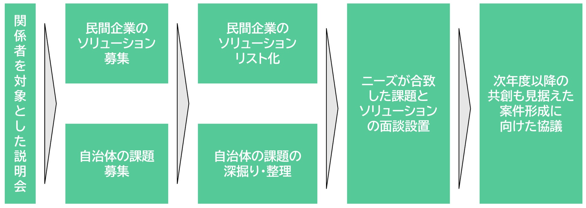 地域課題に挑む全国の企業の取組を公募・選定、課題解決に臨む自治体とマッチング、地域現場での実装に向けた伴走支援を実施。