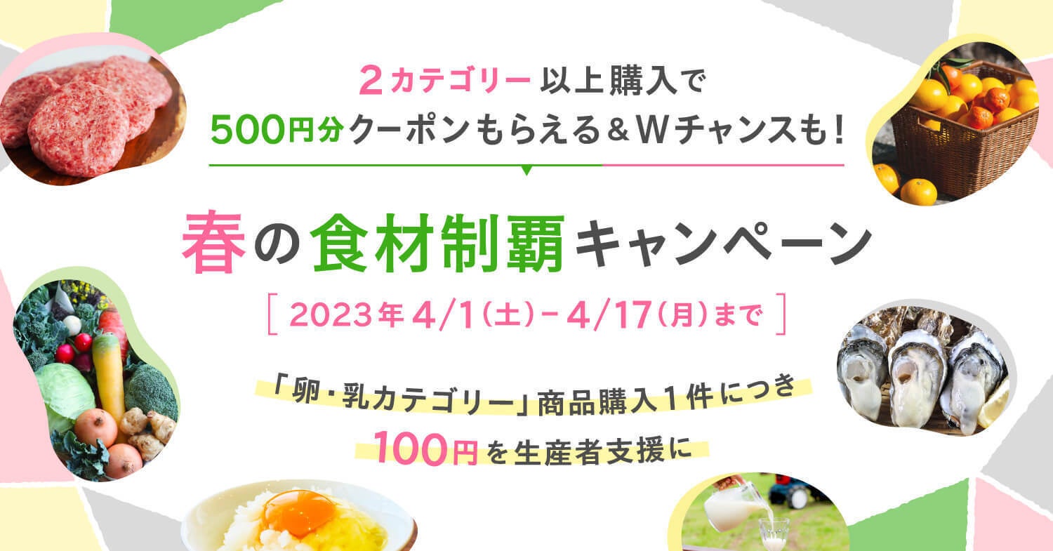 また、同期間で「春の食材制覇キャンペーン」を開催します。本キャンペーンでは、対象期間中にポケットマルシェの全10カテゴリの中から2カテゴリー以上の商品を購入した方へ送料500円OFFクーポンをプレゼントするほか、さらに「卵・乳」カテゴリーの商品を購入した方の中から抽選で100名に送料500円OFFクーポンをプレゼントします。