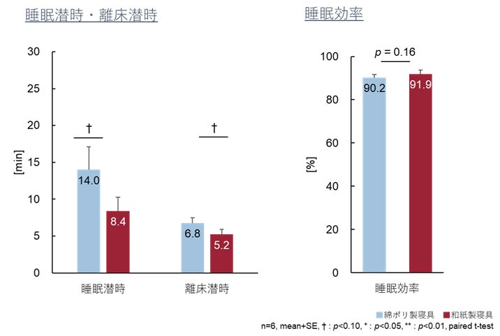 綿ポリ製寝具カバー群と比較して和紙糸製寝具カバー群は睡眠潜時と離床潜時が短縮する傾向が見られました。また、統計学的に有意ではなかったものの、睡眠潜時・離床潜時が短縮した結果、睡眠効率*6も改善する可能性が示唆されました。よって、和紙糸製寝具カバーを使用することで、寝つきの良さ・目覚めの良さが改善する傾向であることがわかりました。