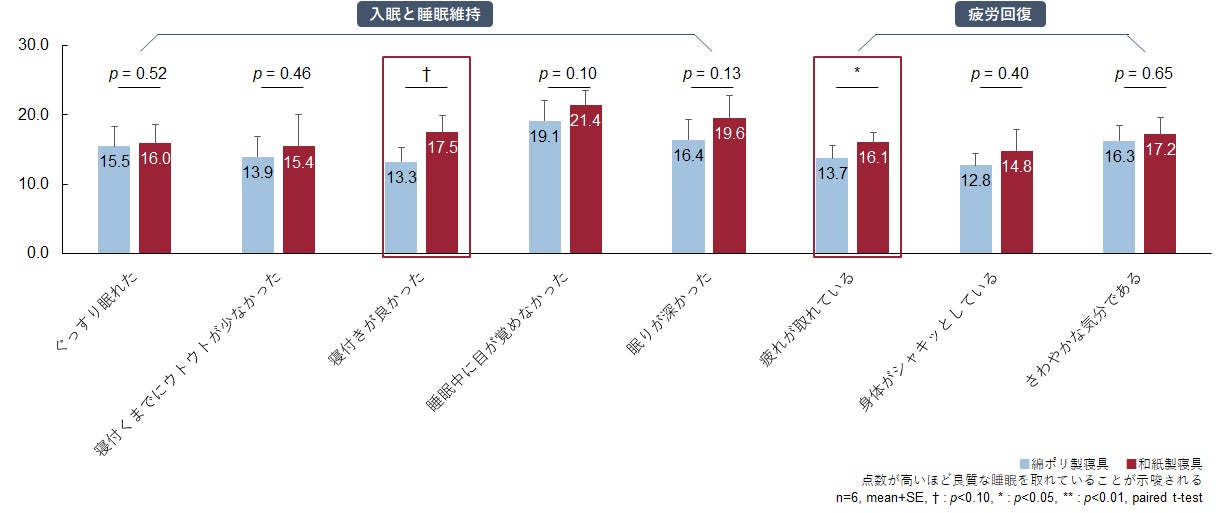 本検証では主観的評価として、OSA睡眠調査票(MA版)を用いました。その結果、和紙糸製寝具カバー群は綿ポリ製寝具カバー群と比較して、「疲労回復」項目の点数が有意に高いことが確認されました。また、「寝付きの良さ」に関しても改善傾向が見られました。このことから和紙糸製寝具カバーによって睡眠の質が高まり、起床後の疲労回復に繋がったと推察できます。