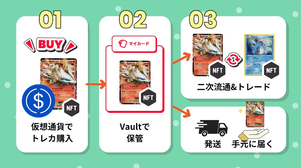 鑑定済みのトレーディングカードをNFTとしてデジタル化し、ブロックチェーン上での所有・取引を可能にするプラットフォームです。NFTはOasys Verse Layer「TCG Verse」で発行されています。