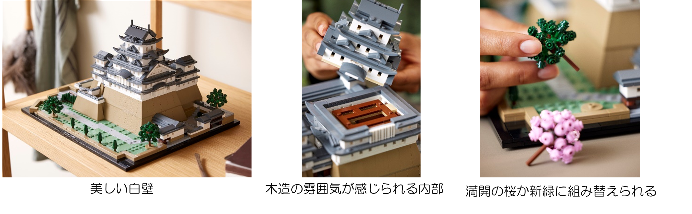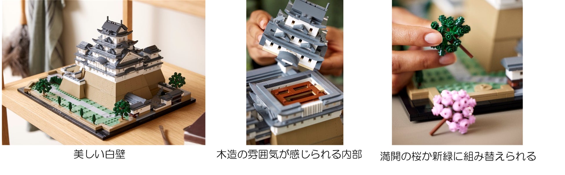 「レゴ®アーキテクチャー 姫路城」は、特徴的な渡櫓で繋がる連立式天守の白壁はもちろん、天守閣を外すと木造の床や柱の雰囲気が感じられる簡易的な内部構造もお楽しみいただけます。さらに、天守を取り囲む備前丸跡の緑地には2本の木が立てられ、満開の桜か新緑のどちらかに組み替えることで季節の移ろいを表現することが出来ます。