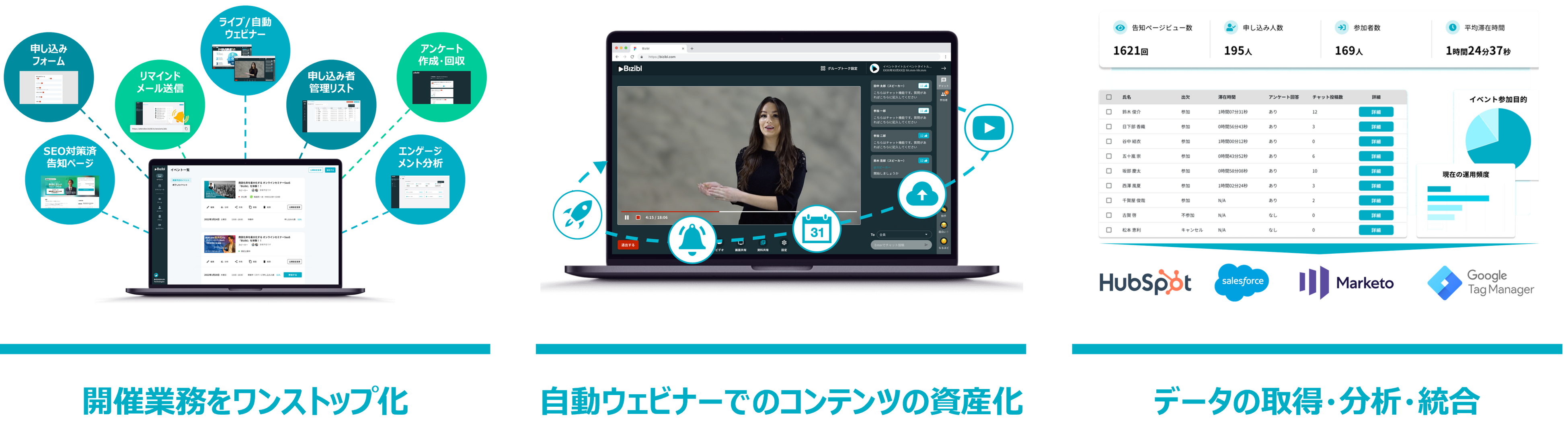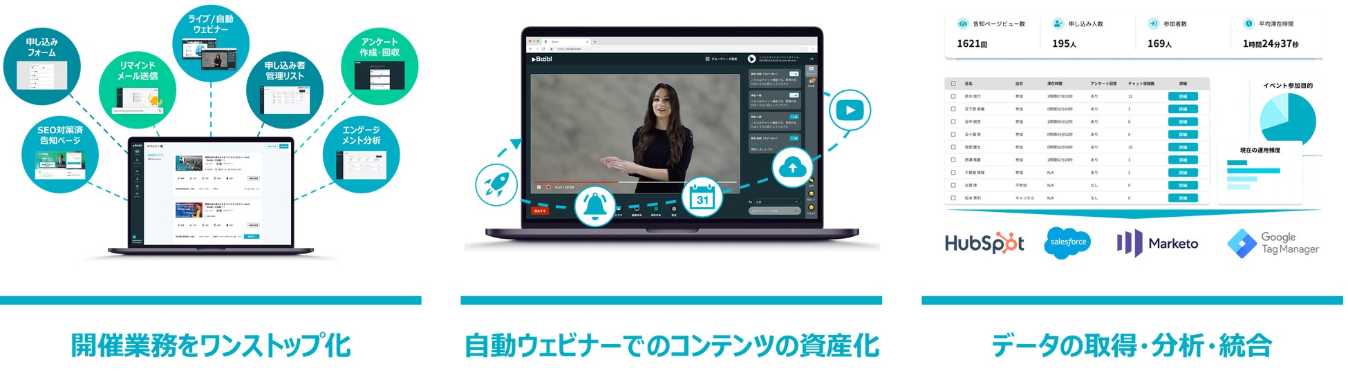 当社が提供する「Bizibl」は、ウェビナー業務の一元化と自動化で工数を削減し、アーカイブとデータ活用で成果を最大化できる、ウェビナーマーケティングSaaSです。 マーケティング利用に特化した独自開発ツールの提供だけでなく、企業の課題に応じた「ウェビナー企画運用支援メニュー」で伴走支援し、収益につながるウェビナーマーケティングを実現いたします。