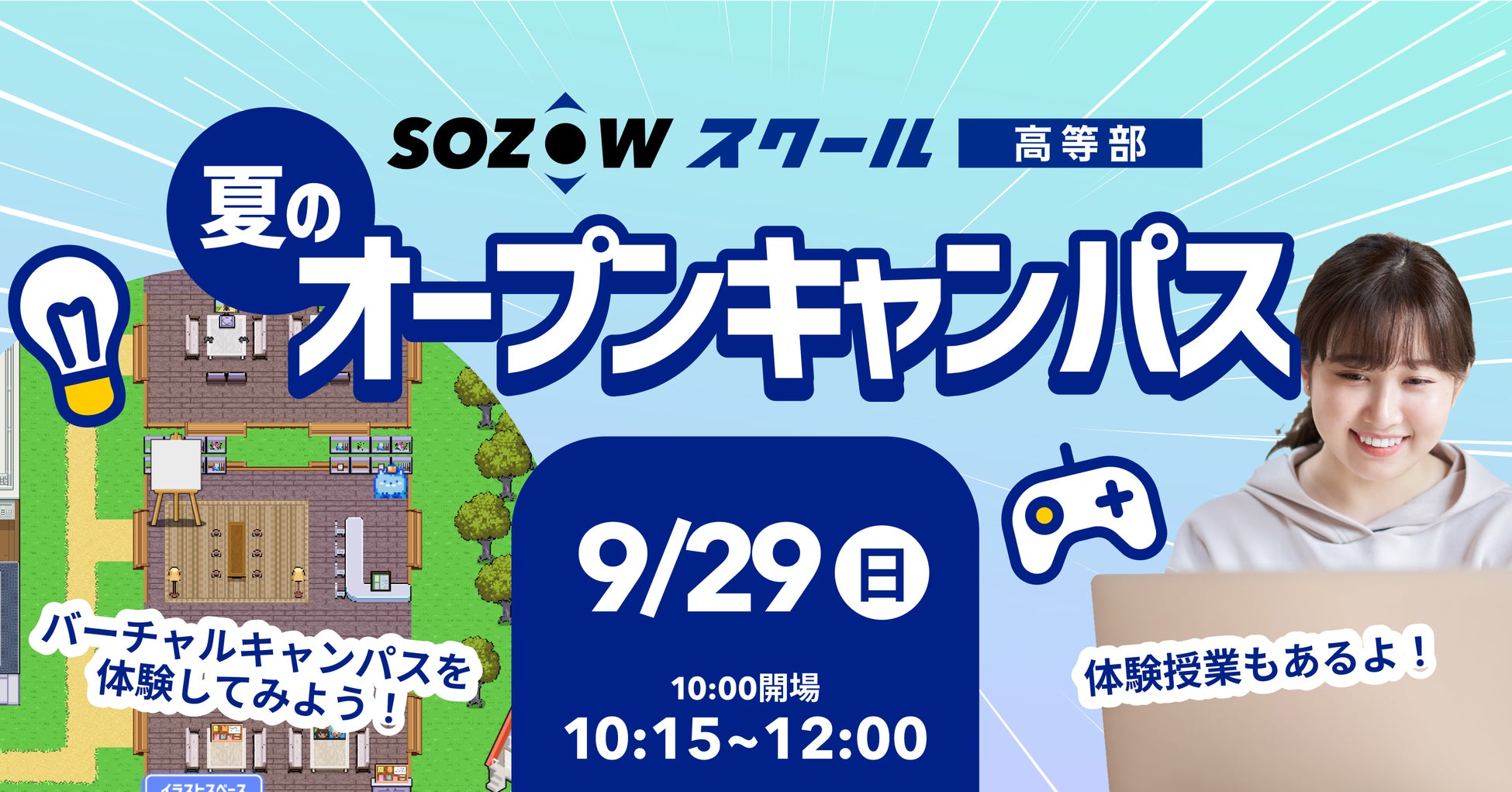 自分のアバターを作ってバーチャルキャンパスに入り、体験授業を受けたり、在籍生徒の声を聞くことができるなど、SOZOWスクール高等部の学校生活を体感できるイベントです。