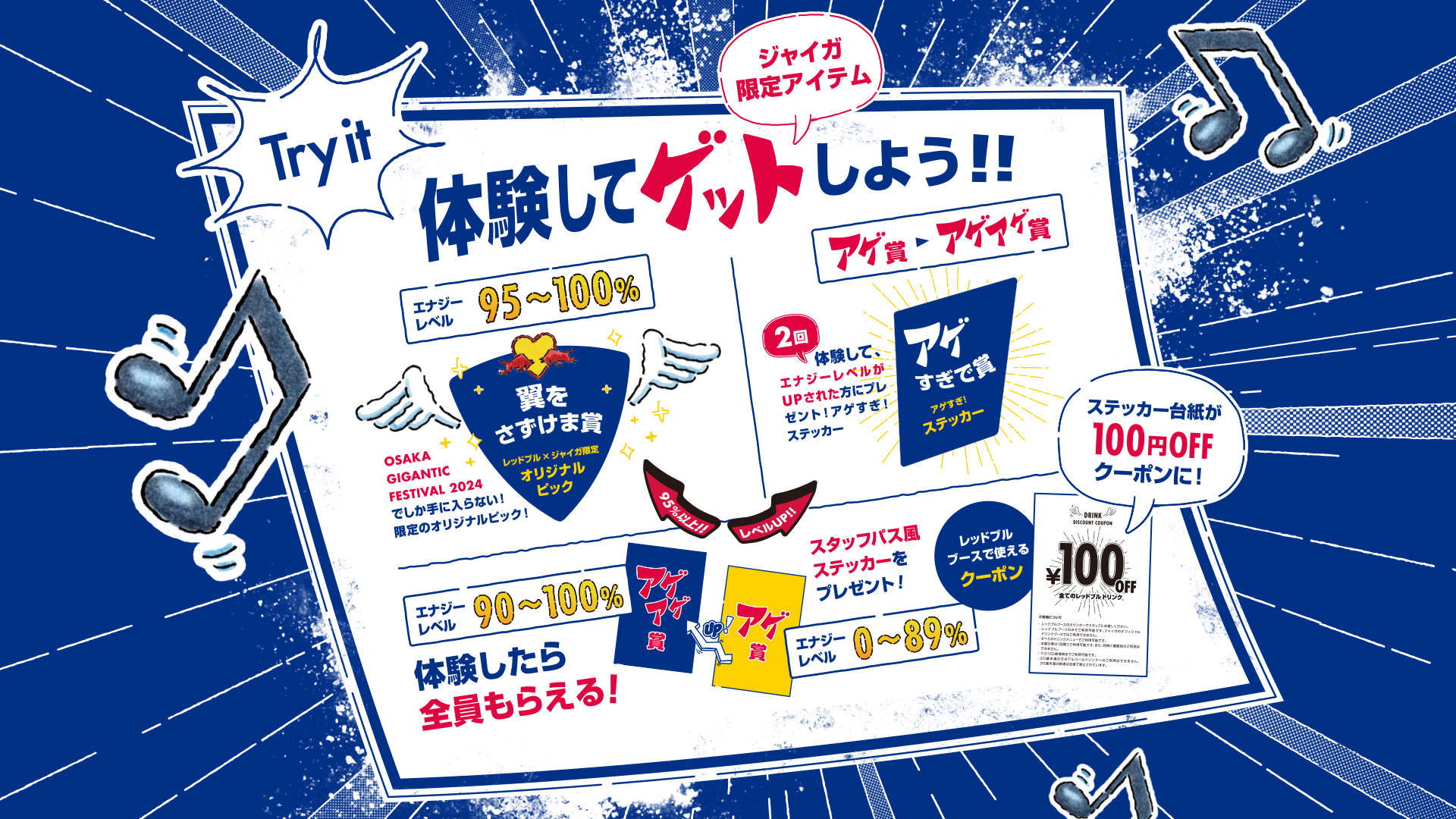 参加方法は簡単で、来場者は「Red Bull アゲアゲAI チェッカー in ジャイガ」のモニター前に立って頂くと、AIが解析を始め、エナジーレベルを測定し、測定値の入った写真を撮るだけです。参加者全員に、エナジーレベルに合わせて、全てのレッドブルドリンク100円OFFクーポンの付いたスタッフパス風ステッカーの「A.アゲアゲ賞」もしくは「B.アゲ賞」がもらえます。さらに、エナジー・レベルが95%以上の方には、「翼をさずけま賞」としてレッドブル×ジャイガ限定・オリジナルピックをプレゼントします。なお、ご自身のエナジーのアゲ度合いに満足せず、2回体験されて、エナジーレベルがランクアップした方には「アゲすぎで賞」として特別ステッカーをプレゼントします。(*各賞は、賞品が無くなり次第、終了となります。)