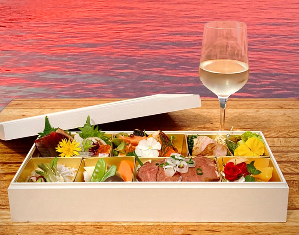 ドリンクに合うアペタイザーやローストビーフなどが入った、和洋折衷のBOXスタイル