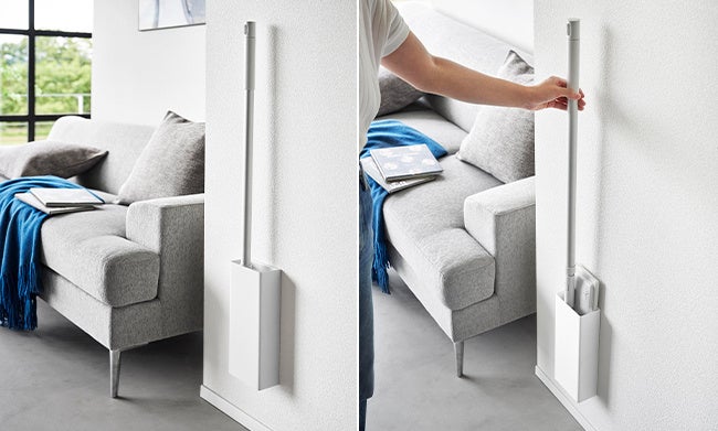 置き場所に困るフローリングワイパーを石こうボードピンで壁に浮かせて収納。