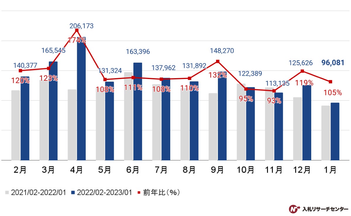 2023年1月の落札案件数の総計は96,081件で、前年比105%となりました。